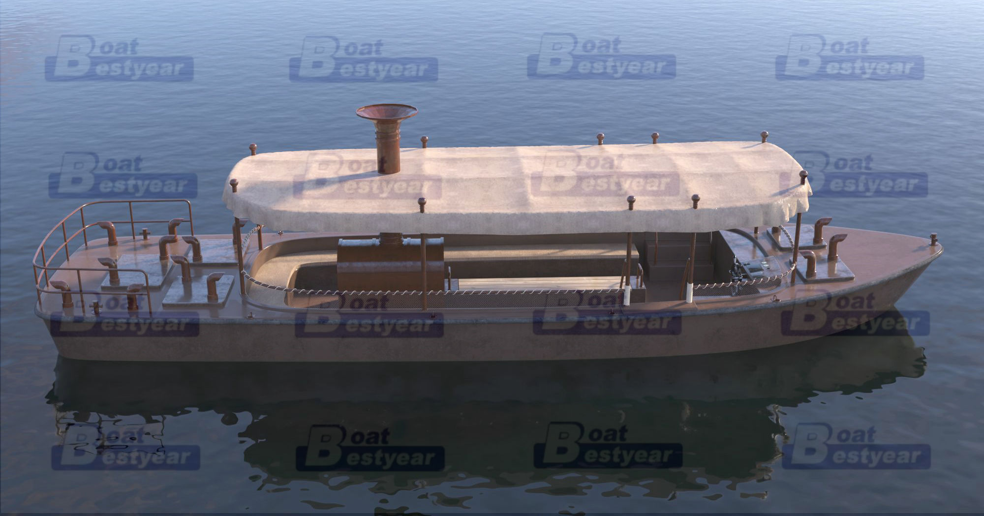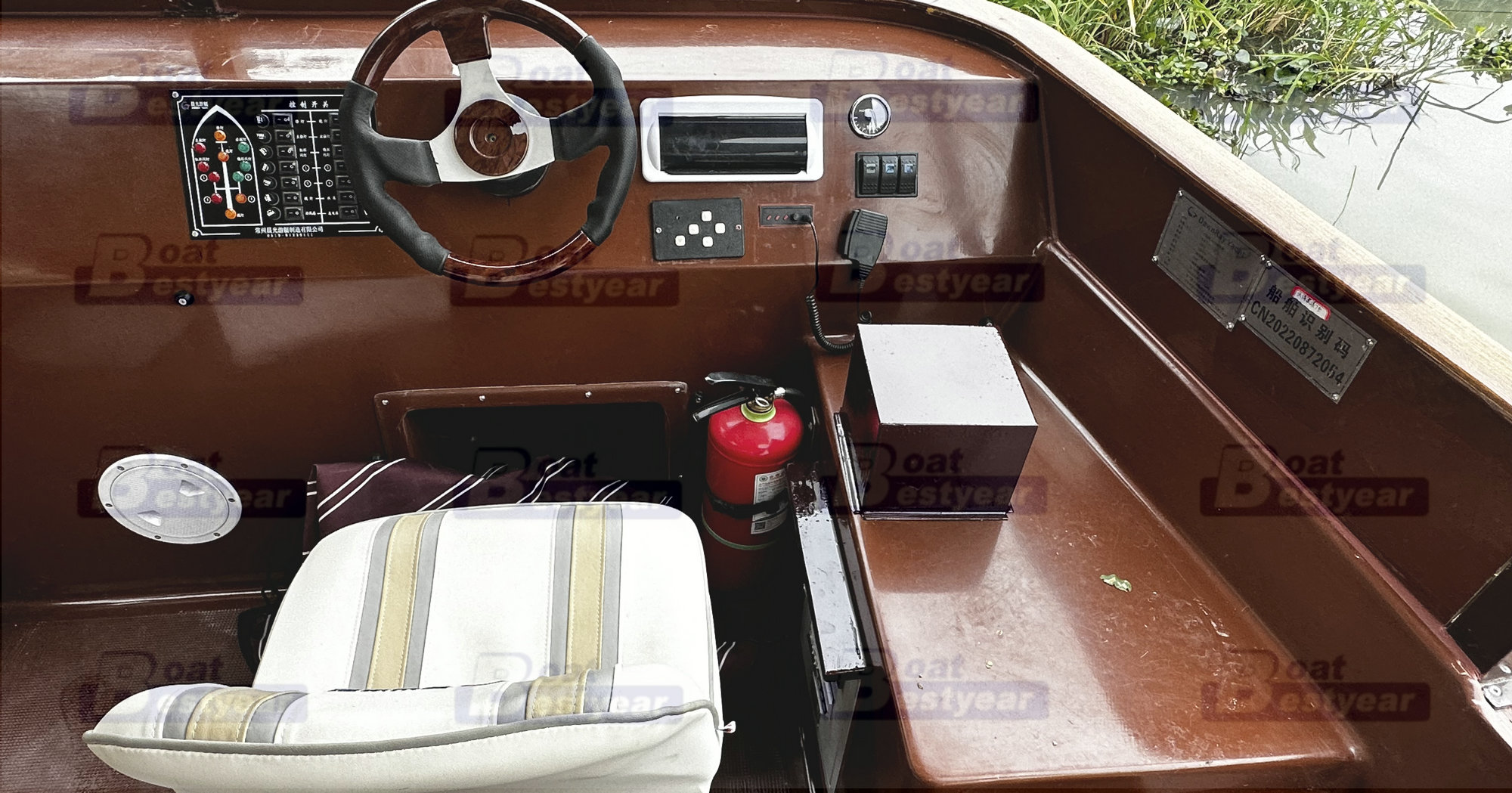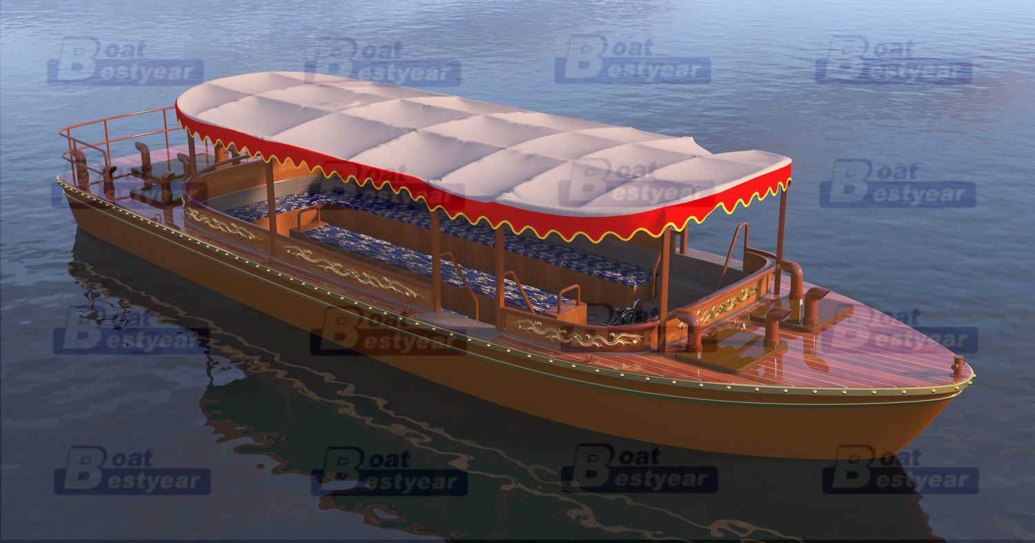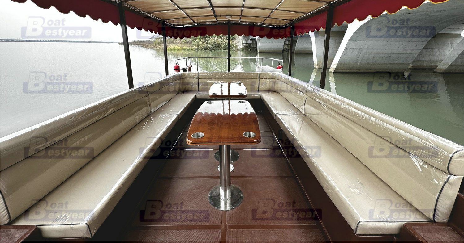 Bestyear PB975A Electric Passenger Boat Sightseeing Boat Fiberglass boat length 9.75m Width 3.25m passegner 16+2 2*3KW electric outboard engines 2x380ah batteries*60 Speed 10Km/h steering system Bench seats with cushion HardTOP canopy