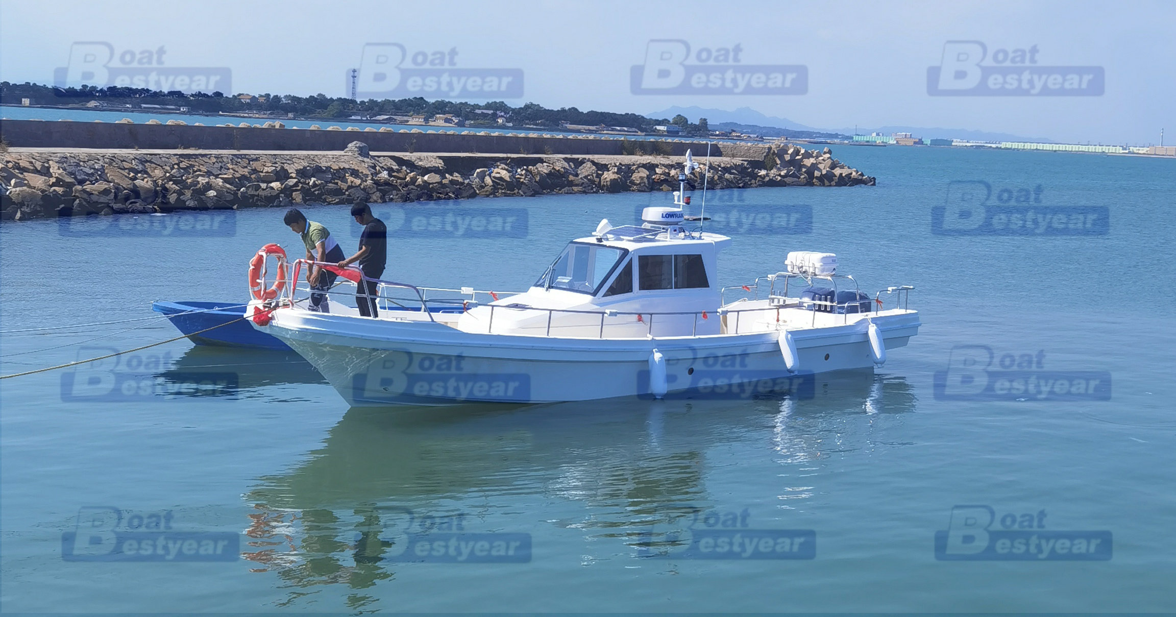 Bestyear FB1130A fishing boat is a type of boat suitable for both recreational and commercial fishing, popular in Japan and South Korea. It has a fiberglass hull, is 11.3 meters long and 2.75 meters wide, features a cabin, and a spacious open deck. The engine can be chosen from two options ranging from 100 to 250 horsepower.