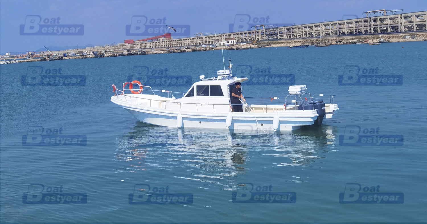 Bestyear FB1130A fishing boat is a type of boat suitable for both recreational and commercial fishing, popular in Japan and South Korea. It has a fiberglass hull, is 11.3 meters long and 2.75 meters wide, features a cabin, and a spacious open deck. The engine can be chosen from two options ranging from 100 to 250 horsepower.